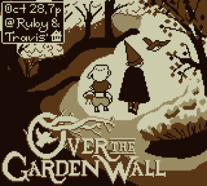 A pumpkin man, a dark beast, with some floating character faces and a frog band leader all looking at two boys and a bird Over the Garden Wall poster October 15, 2024